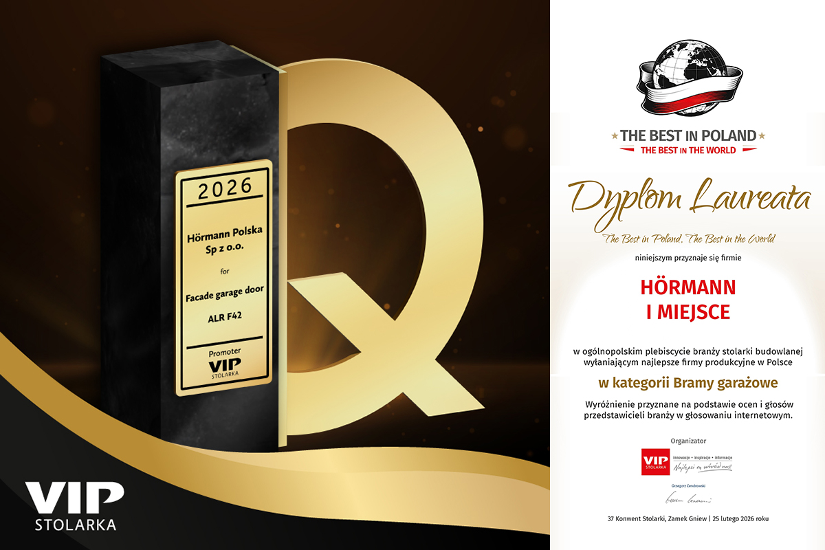 W plebiscycie „The Best in Poland, The Best in the World” portalu Stolarka VIP, firma Hörmann Polska zajęła I miejsce w kategorii Bramy garażowe oraz II w kategorii Drzwi Stalowe, Kompozytowe, Aluminiowe, Hybrydowe. Kapituła doceniła także fasadową bramę garażową ALR F42 Hörmann, której przyznała wyróżnienie WinDoor Quality&Design Award.