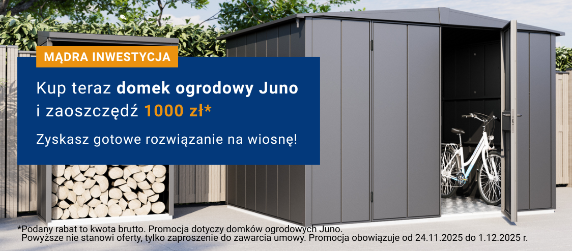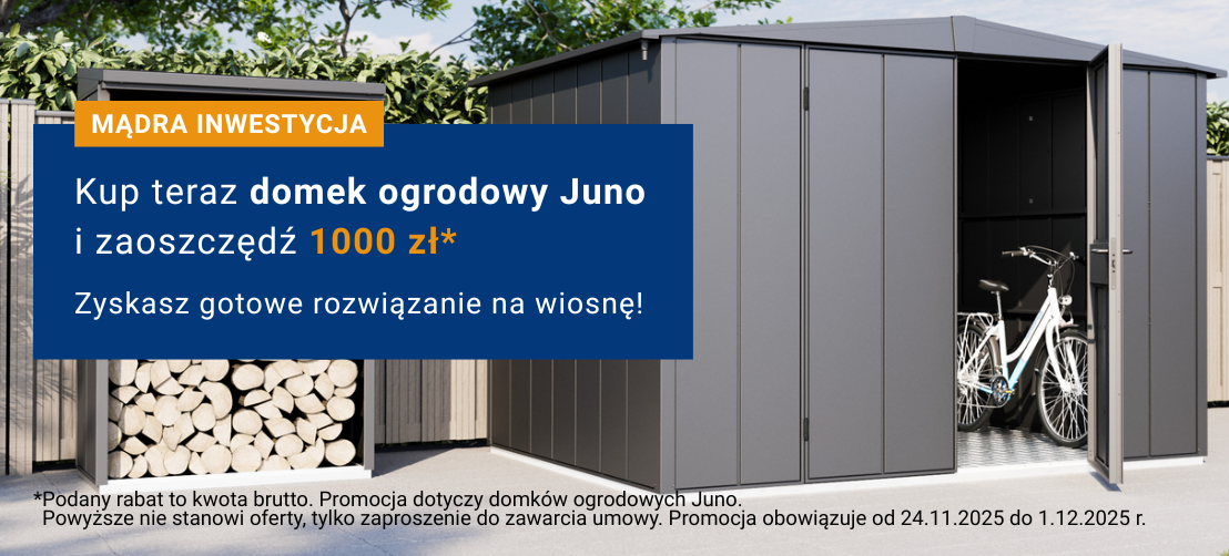 Domki ogrodowe Juno - praktyczne i stylowe rozwiązanie do Twojego ogrodu. Dzięki naszym domkom możesz wygodnie i bezpiecznie przechowywać w ogrodzie narzędzia, rowery i inne rzeczy, które nie muszą zajmować miejsca w domu. To więcej przestrzeni na to, co naprawdę lubisz!